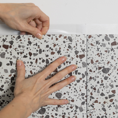 - Remove the backing paper prior to application, but DO NOT remove the clear membrane backing, this should remain in place to form a waterproof barrier for the next tile to be applied on top of